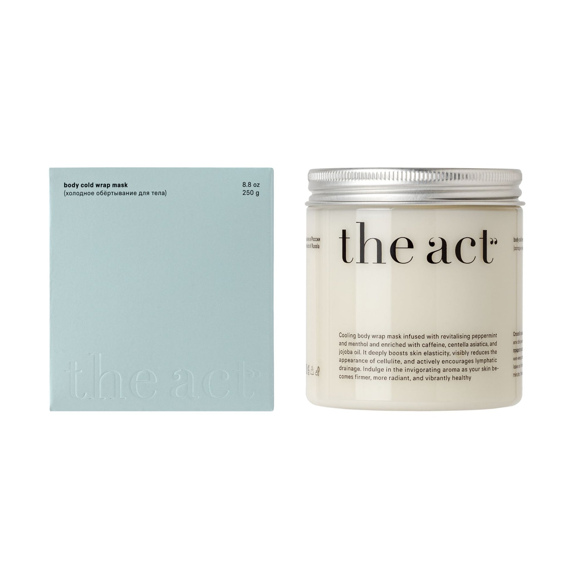 A refreshing cold wrap mask with a functional blend of centella asiatica, caffeine, jojoba oil, and antioxidant plant extracts. It detoxifies, revitalizes, and tones the skin. The stimulating formula enhances lymphatic flow, while the cooling effect of mint and menthol relaxes muscles and relieves fatigue.