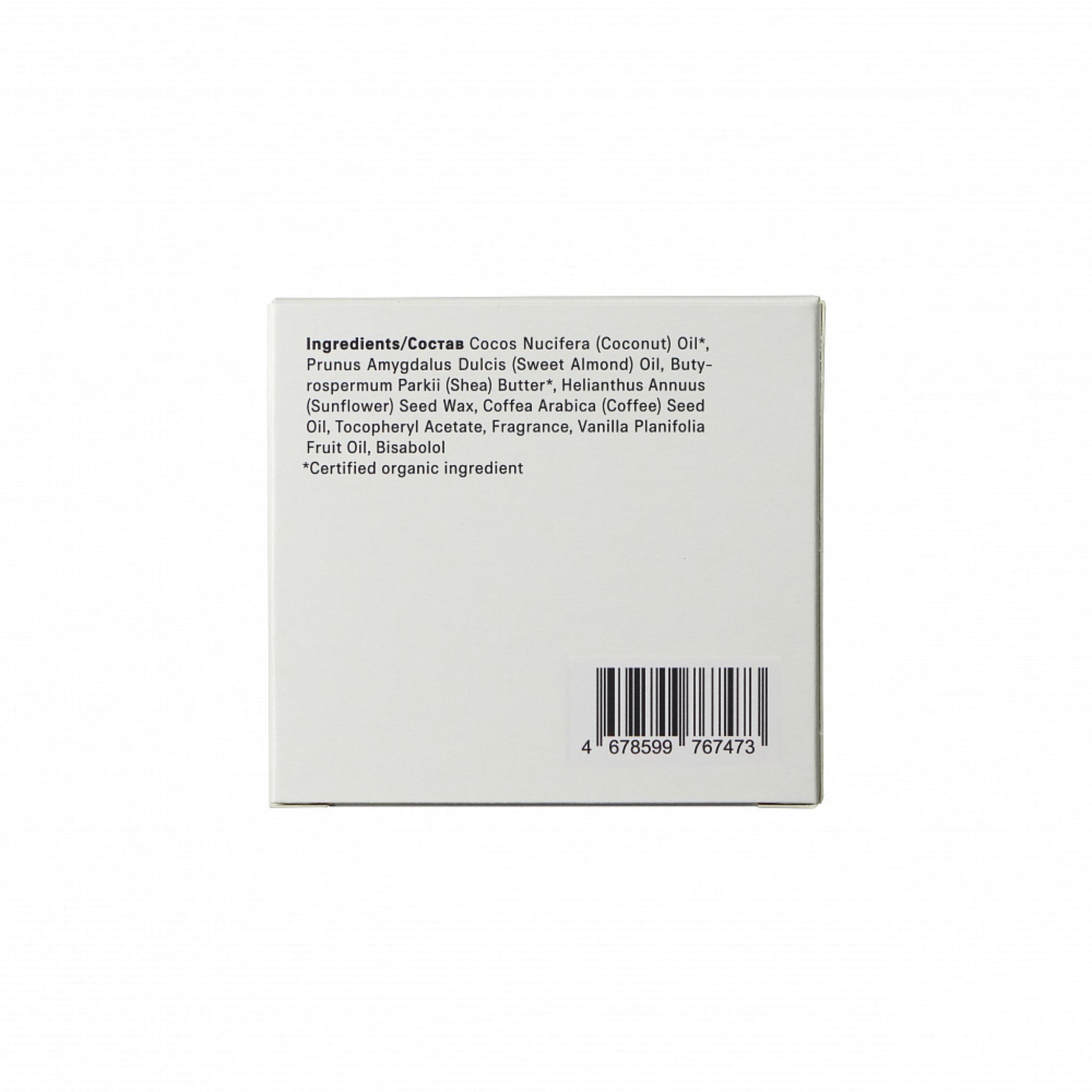 Coconut Oil, Almond Oil, Cocoa Butter, Rice Bran Wax, Stearic Acid, Sunflower Wax, Candelilla Wax, Fragrance, Bisabolol, Green Coffee Oil, Tocopheryl Acetate, Vanilla Oil