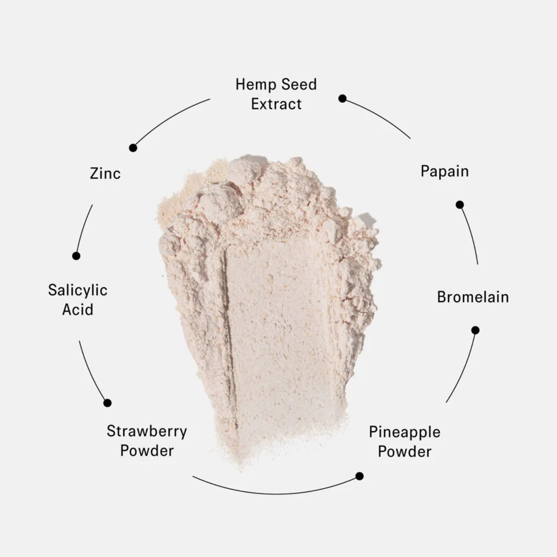 Avena Sativa (Oat) Kernel Flour, Zea Mays (Corn) Starch, Sodium Cocoyl Isethionate, Calamine, Amylodextrin, Ascorbic Acid, Papain, Bromelain, Inulin, Fragrance, Ananas Sativus (Pineapple) Powder, Fragaria Vesca (Strawberry) Powder, Salicylic Acid, Zinc PCA, Hemp Seed Extract, Arginine, Proline, Valine, Allantoin