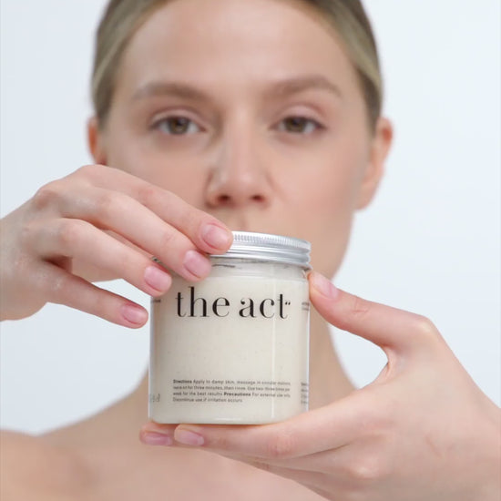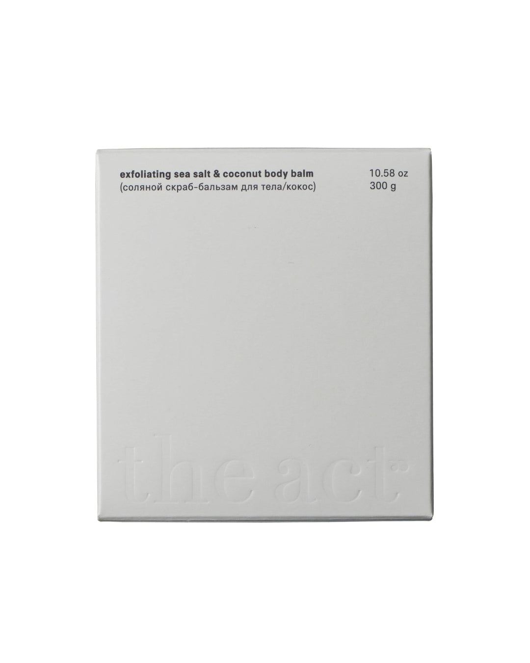 The Act's absolute bestseller is a salt scrub balm with delicate exfoliation and deep skin hydration that does not require applying cream after use. Sea salt and coconut flakes renew the skin, while shea butter, avocado and almond oils saturate with moisture. The thick texture melts, leaving velvety smoothness and a warm aroma of natural coconut.