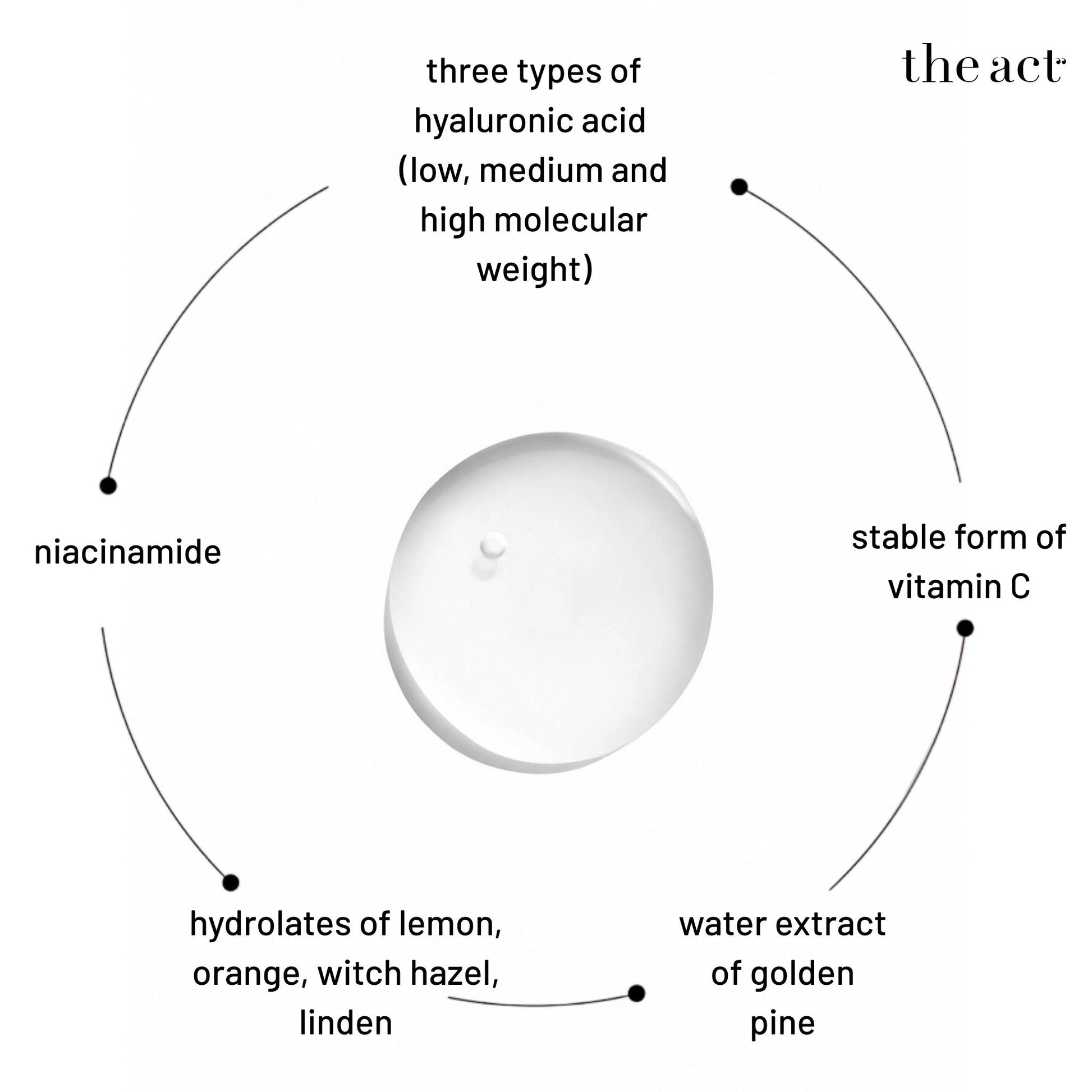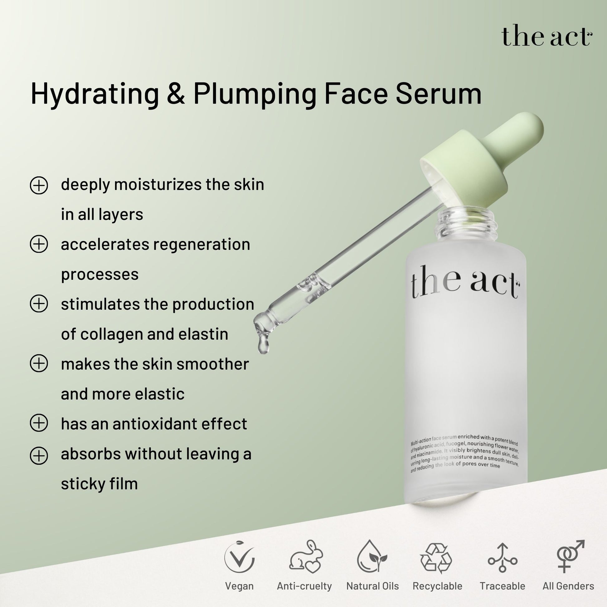 The Act Hydrating face serum contains three forms of hyaluronic acid. Low molecular weight eliminates dehydration. Medium molecular weight quickly improves epidermal hydration, stimulates the production of hyaluronic acid. High molecular weight forms a protective film that prevents moisture loss. The product has a light gel texture. The serum instantly moisturizes the skin and is quickly absorbed, leaving no unpleasant feeling of a sticky film on the face.