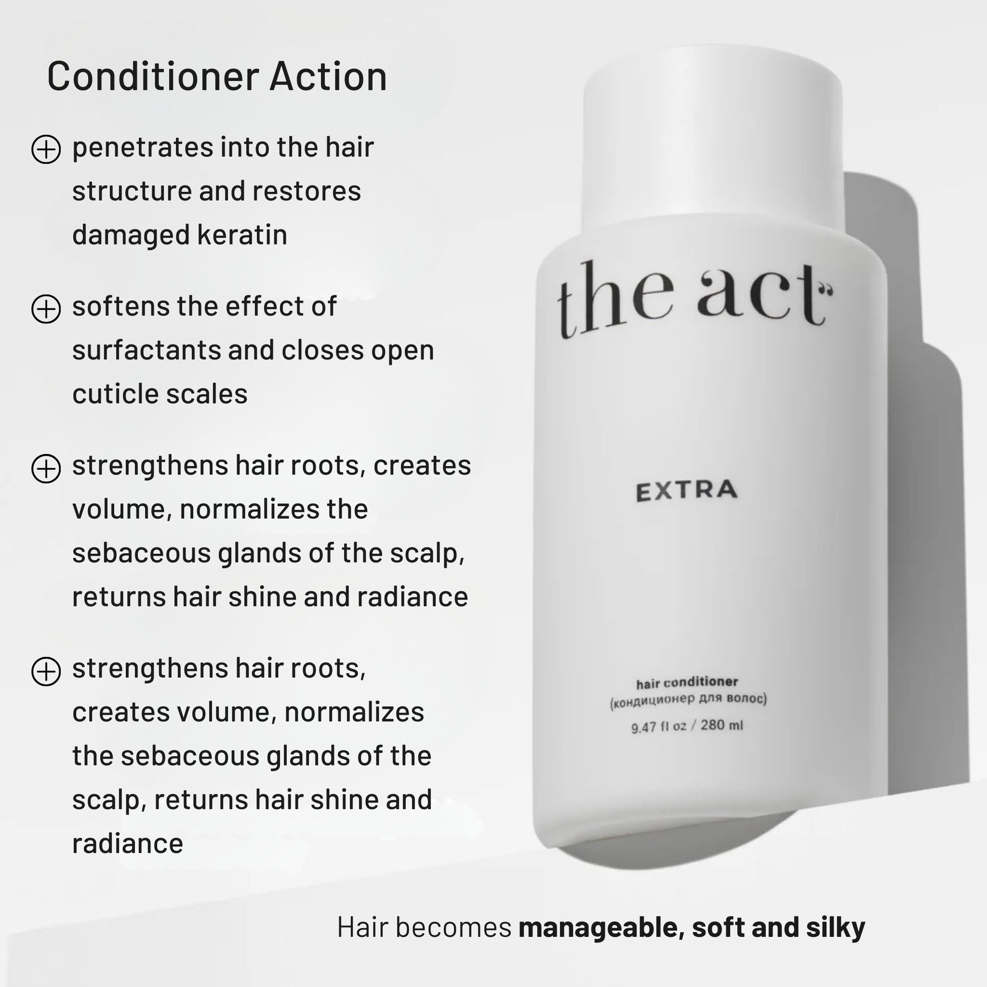 Extra Conditioner with an intensely moisturising formula containing plant proteins, coconut and broccoli oils, plant extracts and hyaluronic acid strengthens hair, makes it easier to comb, adds shine, and increases the visual thickness and density of hair.