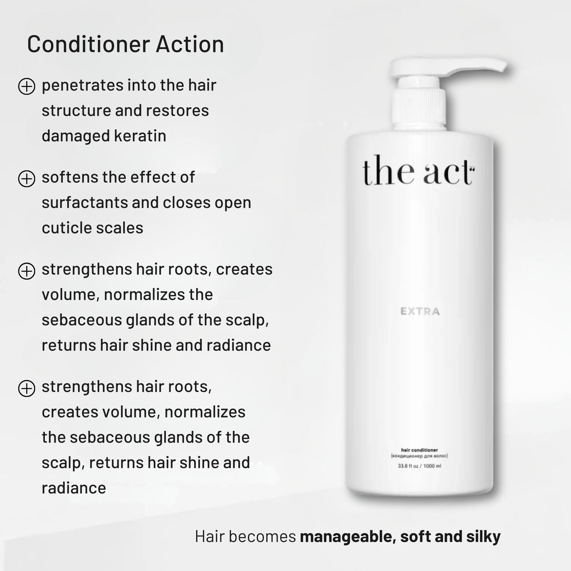 EXTRA Conditioner with an intensely moisturising formula containing plant proteins, coconut and broccoli oils, plant extracts and hyaluronic acid strengthens hair, makes it easier to comb, adds shine, and increases the visual thickness and density of hair.