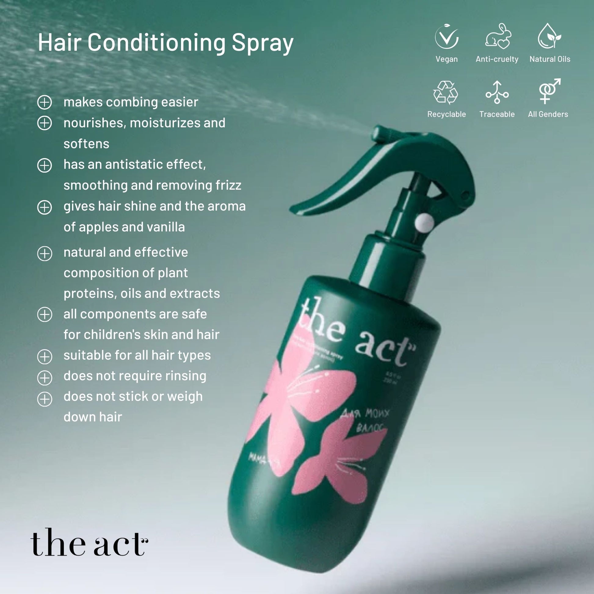 The new product from The Act contains argan oil, plant extracts and proteins. The spray for easy combing moisturizes delicate children's hair, gives it a natural shine and softness. And also surrounds it with a pleasant aroma of vanilla apple.