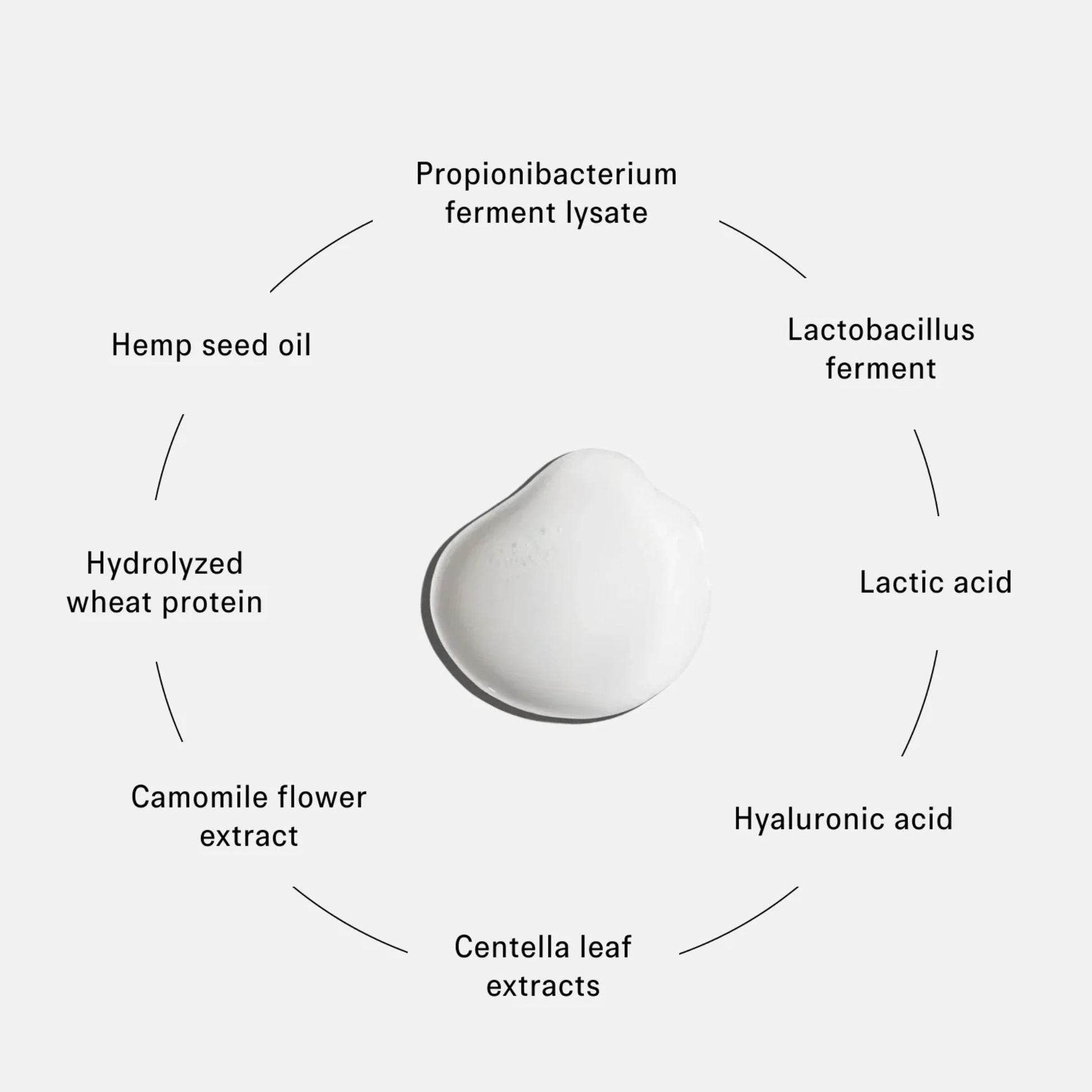 Water, Lauryl Glucoside, Cocamidopropyl Betaine, Sodium Cocoyl Isethionate, Glycerin, Lactic Acid, Benzyl Alcohol, Ethylhexylglycerin, Trehalose, Hyaluronic Acid, Inulin, Wheat Germ Protein, Fragrance, Panthenol, Propionibacterium Lysate, Lactobacillus Lysate, Bifidobacterium Lysate, Niacinamide, Centella Asiatica Extract, Chamomile Flower Extract