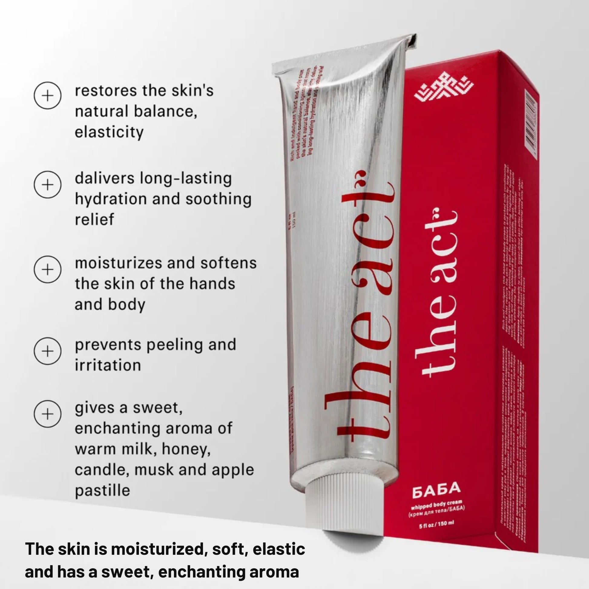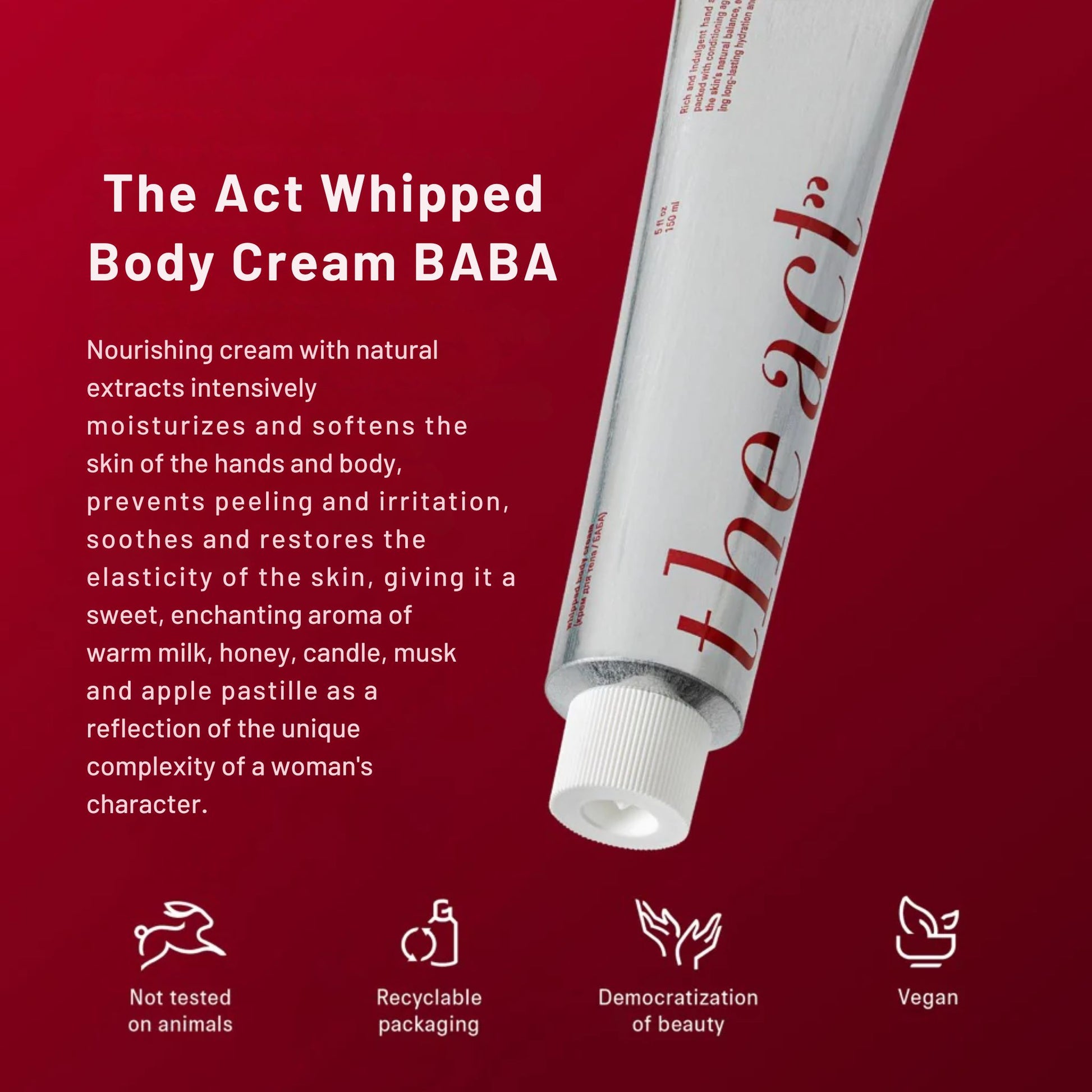 Nourishing cream with natural extracts intensively moisturises and softens the skin of the hands and body, prevents peeling and irritation, soothes and restores the elasticity of the skin, giving it a sweet, enchanting aroma of warm milk, honey, candle, musk and apple pastille as a reflection of the unique complexity of a woman's character.